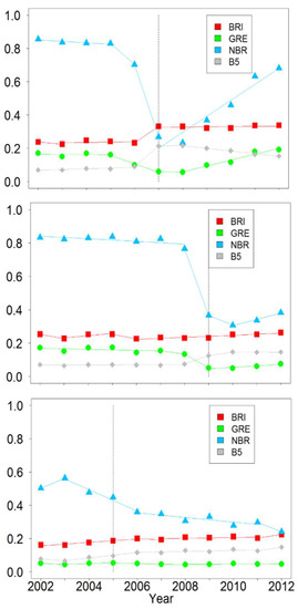 Temporal segmentation of BRI, GRE, NBR, and B5 spectral indices for each of the three forest disturbance types. Typical spectral profiles for forest stem removal (top row), fire (middle row), and stress (bottom row) are shown. Vertical lines denote the year when disturbance was detected by the Global Forest Change Product.