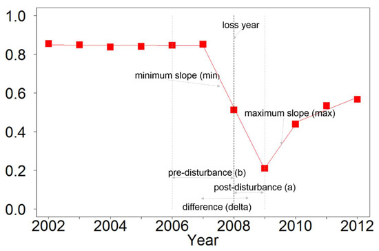 Illustration of the extracted features for every spectral index using the forest loss objects and WELD time series data. Each temporal profile is converted into segments and five features, used in the subsequent classification, are extracted: (1) maximum (max) and (2) minimum (min) slope among all the segments of the trajectory; (3) mean value of the two years before the forest loss year (b), (4) mean value of the two years after the forest loss year (including the disturbance year) (a); and (5) difference between (4) and (3) (delta).