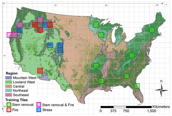 To create a training dataset for the Random Forest classifier, a stratified sampling approach was employed (Figure 3). Twenty-one 150 × 150 km WELD tiles were selected based on the following criteria: (i) at least one tile should be selected in each EPA Level II Ecoregion [56], and (ii) selected tiles should avoid overlapping multiple ecoregions while also encompassing as many forest disturbance objects as possible. Twelve WELD tiles were selected for stem removal training samples, based on documented timber extraction activity [57]. The five tiles with the highest reported tree mortality due to insects in the 2001–2010 period, as reported by the ADS dataset [31], were used to collect stress disturbance training objects. Similarly, the eight tiles with the highest fire occurrence based on the MTBS dataset were used to collect fire training objects (four of those coincided with tiles also used to collect stem removal training objects).