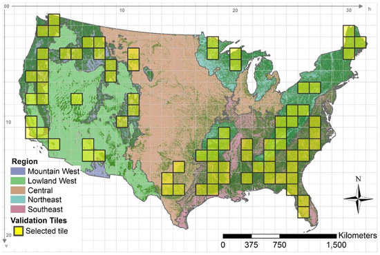 We used a stratified cluster sampling strategy to select validation WELD tiles. Following Cohen et al. [13], sampling strata were produced by merging EPA (Environmental Protection Agency) Level II ecoregion data [56] into generalized strata based on common forest types. The resulting regional strata included Mountain West, Lowland West, Central, Northeast, and Southeast regions (Figure 4). In total, 81 WELD tiles were selected for a validation dataset. Selection of tiles within the five strata utilized a weighted approach, where strata with more forested area and a higher number of forest loss objects received more validation tiles. This strategy produced 19, 9, 6, 23, and 24 WELD validation tiles for the Mountain West, Lowland West, Central, Northeast, and Southeast strata, respectively (Figure 4). Within each of the 81 WELD validation tiles, 50 forest loss objects (>5 pixels in size) were randomly selected and manually classified into one of the three disturbance types using the same methodology as the training dataset; replacement samples were drawn if no disturbance could be confidently detected in the high resolution imagery. The final validation set consisted of 3029 stem removal (299,107 pixels), 595 fire (164,932 pixels) and 426 stress (22,320 pixels) forest loss objects, and 106 objects (2432 pixels) that could not be confidently labeled as disturbed.