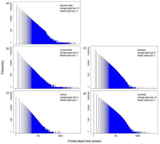 Forest disturbance object size distribution by region: (a) Mountain West, (b) Lowland West, (c) Central, (d) Northeast, and (e) Southeast. Note log-scale x and y axes.