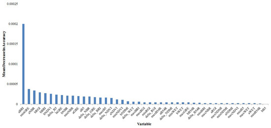 Figure 8 presents the mean decrease in accuracy (relative variable importance) for all predictor variables input into the Random Forest classifier. Post-disturbance brightness (aBRI), minimum spectral trajectory slope for greenness (minGRE), post-disturbance NBR (aNBR), pre-disturbance red-green index (bRGI), and pre-disturbance brightness (bBRI) were identified as the top five most important predictor variables for this classification.