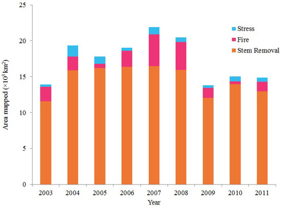 The annual forest loss attributed by disturbance type is shown in Figure 10. In terms of high-magnitude disturbance (>50% forest cover loss) detected in the Global Forest Change Product, stem removal was the dominant forest disturbance agent at the CONUS scale over this time period. The average stem removal area per year was 16,069 km2, while forest loss due to fire and stress were much lower at 2096 km2 and 1022 km2, respectively. The stem removal area shows a clear reduction in 2009–2011 period over the previous year, reflecting the reduced demand of timber due to the 2008 economic recession [66]. Forest loss due to fire and stress was more variable from year to year, likely owing to strong climatic influence on these disturbance agents.