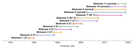 broad band, referred to as the Visible (VIS). Succeeding the Meteosat-1 prototype (1977–1979), the Meteosat 2–7 satellites (1981–2017) acquired full Earth disc images with an on-ground resolution of