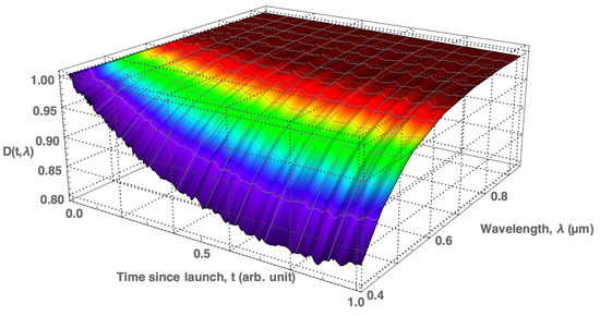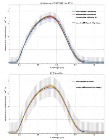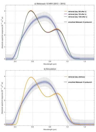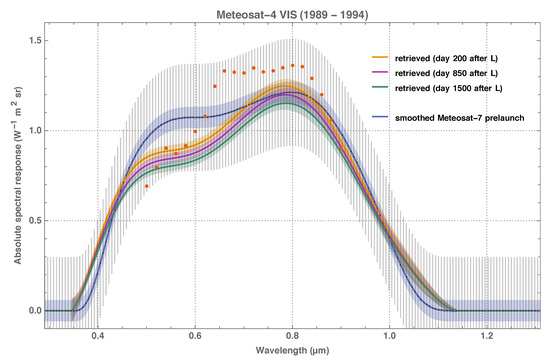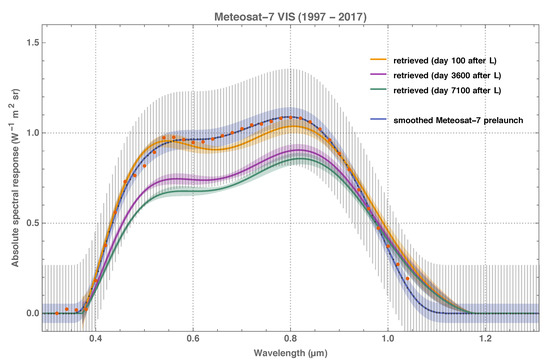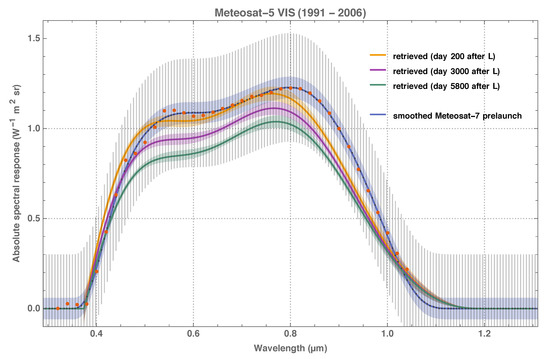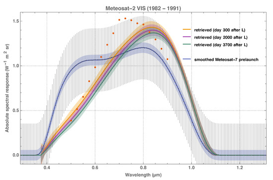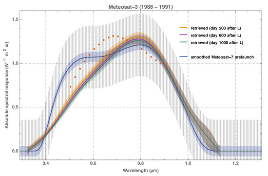 denotes the absolute spectral response function before launch of the satellite. When the degradation of the instrument is not monitored and the data on its spectral response function is not adjusted to the degrading instrument performance, Equation (