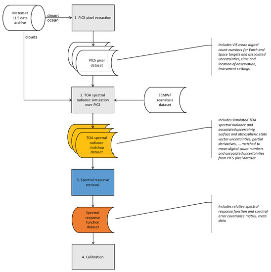 Despite the lack of prior information and the presence of target type-specific biases due to several reasons, the accuracy of the presented method can be improved by refining the identification of ocean and DCC pixels and augmenting the existing MFG matchup datasets with complementary target types, such as green vegetation. Within the composition of target type we have used, ocean targets contribute information in the UV and blue part of the spectrum only, desert targets provide information predominantly in the green to far red part of the spectrum, while DCC targets provide information predominantly in the UV to orange-red and some in the near infrared. This does not mean that DCC targets do not provide information in the red in general, but within the present composition of target types, most information in the red comes from desert targets. Targets with green vegetation, like the Nile delta, may contribute complementary information in the green to near infrared, despite the difficulty that the reflective properties of green vegetation targets are highly controlled by precipitation and will therefore exhibit considerable inter-annual variability. Another considerable improvement were the extraction of PICS data from original Level-0 rather than already processed Level-1.5 data, which would facilitate an individual treatment of the different detectors used in each MFG radiometer.