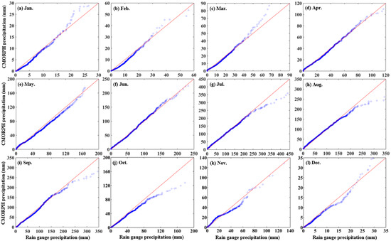 Figure 2. Quantile–Quantile (Q–Q) plots for the monthly Climate Prediction Center morphing technique (CMORPH) versus rain gauge precipitation in the Yellow River basin (YRB). (al) denote January, February, March, April, May, June, July, August, September, October, November, and December, respectively.