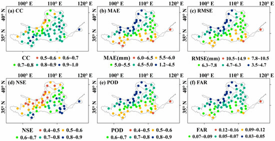 Figure 3. Spatial distribution of six evaluation indicators. (af) denote correlation coefficient (CC), mean absolute error (MAE), root mean square error (RMSE), Nash–Sutcliffe efficiency (NSE), probability of detection (POD), and false alarm ratio (FAR), respectively.