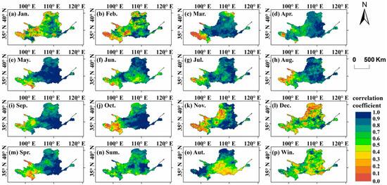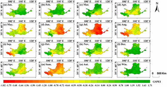 Figure 7. Spatial distribution of drought in the Yellow River basin (YRB). (ap) denote January, February, March, April, May, June, July, August, September, October, November, December, Spring, Summer, Autumn, and Winter, respectively (similar below).