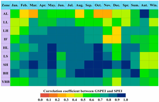 Previous studies have usually calculated the SPEI of a meteorological station based on the precipitation and temperature, and have then obtained the regional drought distribution by spatial interpolation [44,45]. In order to quantitatively explore the correlation between grid-based GSPEI and station-based SPEI, we interpolated the calculated the SPEI to the same spatial resolution (8 km) as the GSPEI, and then compared the correlation between the GSPEI and SPEI (Figure 4). The monthly and seasonal CCs between GSPEI and SPEI are shown in Figure 5. The CC was 0.456 at the significance level of 0.05, and was 0.575 at the significance level of 0.01. On the monthly scale, the average CCs between GSPEI and SPEI in the whole basin from January to December were 0.57, 0.58, 0.72, 0.78, 0.83, 0.73, 0.77, 0.73, 0.76, 0.73, 0.62, and 0.49, respectively. Except for a slightly lower CC in December (CC < 0.5), the CCs between GSPEI and SPEI were higher in the other months, and reached a maximum value of 0.83 in May. The CC between GSPEI and SPEI passed the significance test of α = 0.05 in January and December, and passed the significance test of α = 0.01 from February to November. The average CCs of each subzone were calculated, and the maximum CCs between GSPEI and SPEI from January to December were found in BH (0.81), SH (0.86), SH (0.92), SH (0.89), SH (0.98), IF (0.85), HL (0.88), BH (0.91), SH (0.95), SH (0.96), SH (0.91), and SH (0.81), respectively. On the seasonal scale, the average CCs between GSPEI and SPEI in spring, summer, autumn, and winter were 0.72, 0.73, 0.67, and 0.55, respectively. The CCs passed the significance test of α = 0.01 in spring, summer, and autumn. Although the CC was slightly lower in winter, it also passed the significance test of α = 0.05. The maximum CCs in spring, summer, autumn, and winter were found in SH (0.95), BH (0.92), AL (0.95), and BH (0.68), respectively. In summary, most of the maximum CCs between GSPEI and SPEI appeared in SH and BH in each month and season. The positive correlation was high in spring, summer, and autumn, and they all passed the significance test of α = 0.01. CMORPH satellite precipitation data accurately captures the precipitation information of the YRB, and the GSPEI calculated by using CMORPH data can better reflect the gridded drought characteristics of the YRB. Because CMORPH precipitation data had high spatial and temporal resolution, and the drought characteristics reflected by CMORPH and meteorological station data had strong positive correlation, CMORPH data could be used as a substitute for meteorological station observation data for drought monitoring in the YRB.