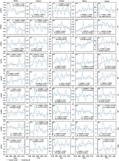 The GSPEI calculated by using CMORPH precipitation data can be used to evaluate the gridded drought characteristics of the YRB. In order to explore the seasonal and annual drought characteristics of the YRB during 1998–2016 in detail, ESMD decomposition of seasonal and annual GSPEI was carried out in the whole basin. When the trend item R corresponded to the minimum variance ratio and the optimal screening times were reached, the ESMD decomposition stopped automatically; thus, the long-term overall variation trend of drought could be obtained (Figure 6). The trend item R based on ESMD decomposition can well reflect the temporal evolution characteristics of drought, which was the adaptive global average line of the sequence. From Figure 6, it can be seen that drought trends in eight subzones were obviously different on the seasonal and annual scale. On the seasonal scale, the subzones with an increasing drought trend were AL, LL, LH, and BH in spring; AL, LL, LS, SH, and BH in summer; SH and BH in autumn; and SH and BH in winter. The subzone with the most obvious trend of drought was AL in spring, and the linear tendency rate of GSPEI was −0.07/10a. The seasonal drought in other subzones showed a decreasing trend. The most obvious drought mitigation trend occurred in HL in autumn, and the linear tendency rate of GSPEI was 0.11/10a. On the annual scale, the subzones with an increasing drought trend were AL, LL, SH, and BH, with an SPEI linear tendency rate of −0.09/10a, −0.435/10a, −0.162/10a, and −0.17/10a, respectively. The drought in LH, IF, HL, and LS showed a decreasing trend, especially in HL (P < 0.01), with an SPEI linear tendency rate of 0.864/10a. It was notable that both seasonal and annual drought showed an increasing trend in BH.
