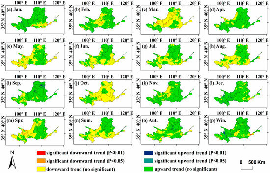 Figure 8. Monthly and seasonal trends of Gridded Standardized Precipitation Evapotranspiration Index (GSPEI) in the Yellow River basin (YRB) during 1998–2016 by using the Modified Mann–Kendall (MMK) trend test method.