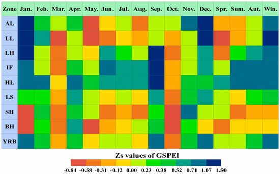 Figure 7 illustrates the spatial distribution characteristics of monthly and seasonal drought based on the GSPEI in the YRB. The monthly and seasonal GSPEI was the average value during 1998–2016. On the monthly scale, the average GSPEI values for all grids in the YRB from January to December were 1.34, 1.33, 0.51, −0.02, −0.77, −1.40, −1.67, −1.32, −0.20, 0.49, 0.61, and 1.33, respectively. It can be concluded that the most serious drought occurred in July, followed by June and August. As shown in Figure 7g, drought occurred in almost the whole basin in July, and the minimum GSPEI value reached −1.82. The GSPEI value decreased gradually from January to July, which indicated that drought was aggravating. And the GSPEI value increased gradually from July to December, indicating that drought was slowing down. The average monthly GSPEI values in each subzone were calculated, and the subzones with the most serious drought from January to December were AL (0.97), AL (0.94), LS (−0.32), LS (−0.43), HL (−1.11), SH (−1.57), IF (−1.80), AL (−1.52), AL (−1.39), BH (−0.74), SH (−0.52), and AL (0.95), respectively. These subzones should pay attention to drought monitoring and formulate timely drought prevention and mitigation measures in the months when drought was relatively serious. Drought was relatively mild in other subzones. On the seasonal scale, drought disasters were more seriousl in summer in the YRB, with an average GSPEI value of −1.46, and the drought grade was moderate, as seen in Table 2. Drought was relatively mild in the other seasons, and the average GSPEI values in spring, autumn, and winter were −0.09, 0.30, and 1.33, respectively, which was consistent with the conclusions of the seasonal GSPEI in Section 3.2.1. The average seasonal GSPEI values in each subzone were calculated, and the subzones with the most serious drought in spring, summer, autumn, and winter were HL (−0.68), AL (−1.49), AL (−0.42), and AL (0.95), respectively. These subzones should formulate specific drought resisting measures for the season when drought is relatively serious, which could alleviate the losses caused by drought and help to improve the overall drought resistance level of the YRB.