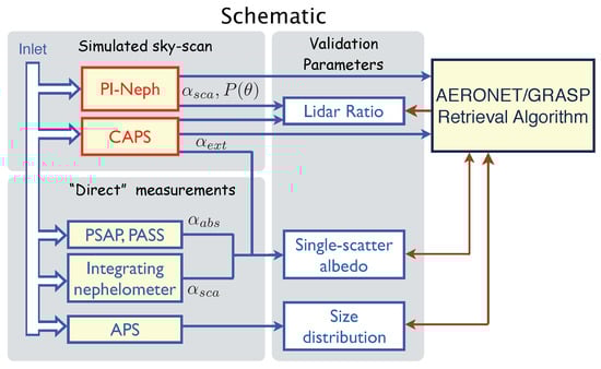 Apparatus for comparing aerosol remote sensing retrievals to in situ measurements. The Polarized Imaging Nephelometer (PI-Neph) and Cavity Attenuated Phase Shift monitor (CAPS) provide angular scattering and extinction measurements required for the Generalized Retrieval of Aerosol and Surface Properties (GRASP) retrieval algorithm. The GRASP algorithm reports the LiDAR ratio, single-scatter albedo, and the aerosol size distribution; results are verified with “direct” in situ measurements shown in the lower left corner, including the Particle Soot Absorption Photometer (PSAP), the Photo-Acoustic Soot Spectrometer (PASS), an integrating nephelometer, and Aerodynamic Particle Sizer (APS).
