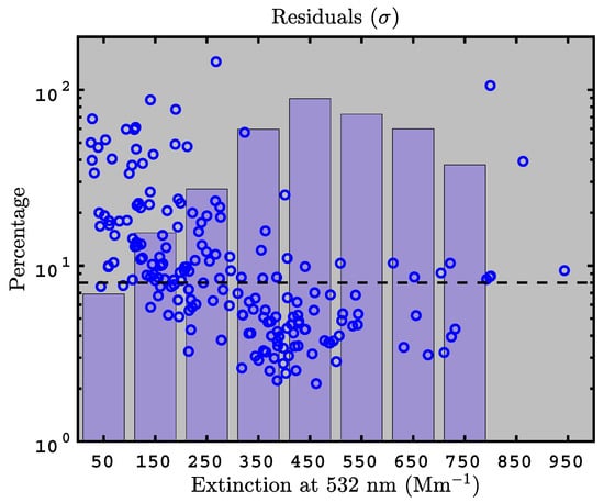 Circles indicate GRASP residuals as a function of extinction for 195 successful PI-Neph measurements (using PSAP absorption measurements and a simulated solar zenith angle of ). The dashed line shows maximum residual allowed for Level 2 Aerosol Robotic Network (AERONET) retrievals (i.e., %). The bars indicate the percentage of retrievals that satisfy the % requirement in each extinction bin.