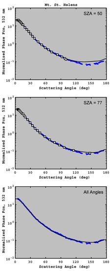 Illustration of AERONET angular sampling for one of the test samples (volcanic ash from Mt. St. Helens, PM size cut). The small blue dots show the normalized phase function (532 nm wavelength) measured with the PI-Neph and averaged to one degree; these are identical in all three panels. The large squares in the top panel indicate subsampling used by AERONET instruments at a solar zenith angles of 50 degrees, while the squares in the middle panel indicate subsampling used by the AERONET instruments at a solar zenith angles of 77 degrees. The solid black lines in the top two panels show the phase function retrieved by the GRASP algorithm using the subsampled angles (squares). The black line in the bottom panel shows the retrieved phase function when the GRASP algorithm uses all available measurements (small blue dots).