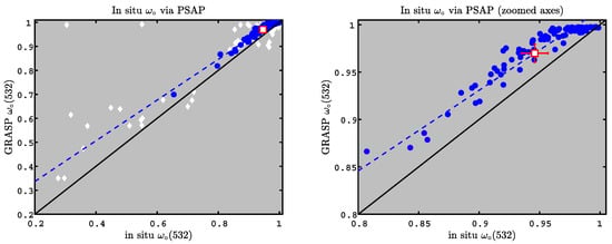 Figure 4 provides a comparison of GRASP vs in situ for one of the above methods; here, the in situ was determined by Equation (3) using PSAP absorption measurements for and the CAPS extinction measurements for . Additionally, the PI-Neph data was subsampled with a simulated solar zenith angle of 50 for the GRASP input (e.g., see the top panel of Figure 3). The blue circles of Figure 4 indicate retrievals with residuals of 8% or less, which is consistent with AERONET Level 2 quality control at high . The white diamonds indicate retrievals with residuals greater than 8%. Blue circles in the left and right panels are identical, but the right panel has zoomed axes. Both panels indicate that the two datasets are highly correlated, with a correlation coefficient of for data that comply with the 8% residual restriction. The GRASP algorithm has a bias of +0.024 with respect to the in situ measurements when subject to the 8% residual restriction. Additional statistics for the blue circles are provided in Table 2.