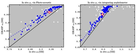 Comparison of single-scatter albedo derived using GRASP to derived directly from in situ measurements. GRASP retrievals use scattering angles identical to data with solar zenith angles of 50 in the AERONET database. Left panel uses photo-acoustic absorption coefficients to determine , whereas the right panel uses the integrating nephelometer. Blue circles indicate GRASP retrievals that have residuals of less than 8%, while white diamonds indicate the additional scatter that occurs when residuals are not restricted. Red square is the mean value, and error bars represent two standard deviations of the mean. Solid lines are 1:1 and dashed blue lines correspond to linear regression of the blue circles; statistics presented in Table 2.