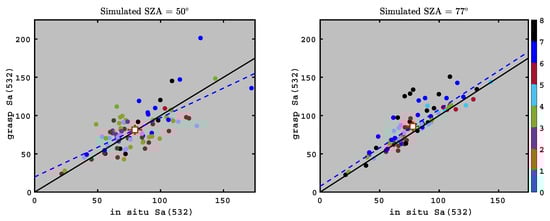 Results for 89 samples are shown in Figure 6; here, we used the PSAP absorption coefficients to determine and simulated solar zenith angles of 50 (left panel) or 77 (right panel). The circles correspond to retrievals with residuals ≤8% and are color-coded by the GRASP residual values. Linear regression statistics are shown in Table 3. Figure 6 indicates that individual GRASP-based calculations of can have substantial errors when , but the average value lands close to the 1:1 line (red square). The statistics presented in Table 3 also indicate that GRASP has substantial skill at computing for an ensemble of retrievals at this solar zenith angle (50): the correlation coefficient is cc = 0.714, the absolute bias is 1.79 sr, and the relative bias is 2%. The slope and intercept are 0.774 and 19.8 sr when , but these values improve to 1.004 and 7.55 sr when considering the 77 solar zenith angle. Further improvements in the correlation and absolute bias are achieved if 1-degree sampling is used for the GRASP retrievals.