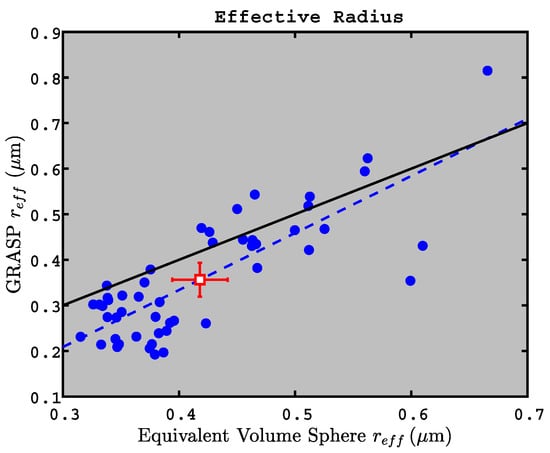 Note the spuriously high value of in the lowest-radius bin of the in situ measurements in Figure 8, which often occurred during the STEAR experiment. This spurious behavior occurs because the lowest-radius bin captures all particles smaller than a certain size; consequently, this bin has a larger bin width than all the other bins. Therefore, particle volumes cannot be computed accurately for the particles in that bin, so we do not include the first APS bin in the effective radii and effective variance calculations of Equations (10) and (11). We also adjust the lower integration limit of the GRASP size distributions to match the in situ lower limit (for Figure 8, this is 0.19 m) so that both methods cover the same range of particle sizes.