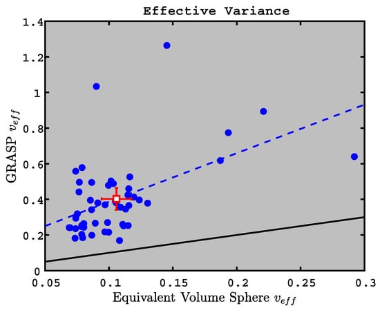 We compare GRASP effective radii and variances (with a simulated ) to equivalent-volume effective radii and variances in Figure 9 and Figure 10, using or to convert aerodynamic size to equivalent volume size. Linear regression statistics for the effective radius and effective variance comparisons are shown in Table 3 for , , and 1-degree sampling. Here we see that the absolute bias of the effective radius ranges from to m and that the absolute relative bias is always less than 22%. (Please note that the subsampled GRASP retrievals that simulate AERONET produce lower biases than the 1-deg sampling.)