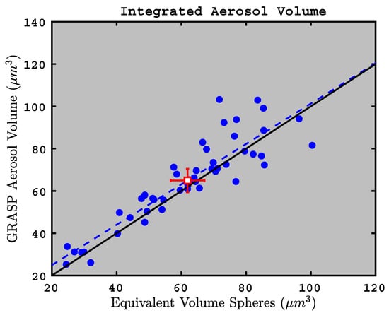 Comparison of retrieved size distribution (GRASP) with APS measurements of equivalent volume spheres for dry PM volcanic ash that was erupted from Mount St. Helens. The GRASP size distribution was obtained using a simulated solar zenith angle of 50, and the APS aerodynamic size measurements were converted to equivalent volume spheres using a dynamic shape factor of ; this is the minimum -value consistent with Mie theory and extinction measurements (as discussed in Section 4.3). Relative bias of the GRASP effective variance with respect to APS measurements for this case is 2.94, which is close to the average variance bias of 2.80 shown in Table 3 at .