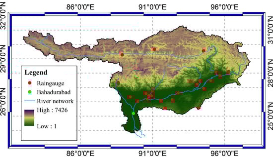 Brahmaputra River flows through Tibet (1625 km), India (918 km) and Bangladesh (363 km) for a total length of 2880 km [38]. The river has several tributaries, which differ in characteristics due to their topography, climate and land use. Generally, the flow of the river can be characterized as low flows in winter and high flows during summer due to the effect of snowmelt and monsoon rainfall. The Indian part of the basin was the main focus of the study. Accordingly, the outlet of the basin was considered at Bahadurabad (Figure 1) and the part of the basin in Bangladesh was not considered. At Bahadrudabad the annual average discharge is about 21,993 m3/s with a minimum and maximum recorded discharge values of 3280 m3/s and 102,534 m3/s [37,39,40].