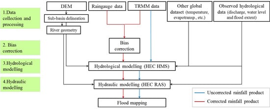 The main methodology proposed in this study is presented in Figure 2. Below, the different sub-sections reflect the methodological steps followed in this study. Two different approaches were used to derive flood maps. In the first (blue line in Figure 2), only freely available global datasets were used as the model forcing. In the second one (red line in Figure 2), the satellite-based rainfall data were corrected using in-situ rain gauge data and then used as model input.