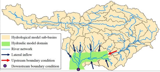 The downstream part of the basin ending at Bahadurabad was chosen as the domain of the hydraulic model. For this reason, the discharge data simulated with the hydrological model HEC-HMS was used as the upstream boundary condition for the hydraulic model, while the normal depth was chosen as the downstream boundary condition. Simulated flows from the sub-basins and tributaries (from the hydrological model) corresponded to the lateral inflows to the hydraulic model domain (see Figure 3). More details on the calibration and validation periods of both hydrological and hydraulic model are reported in Table 2.