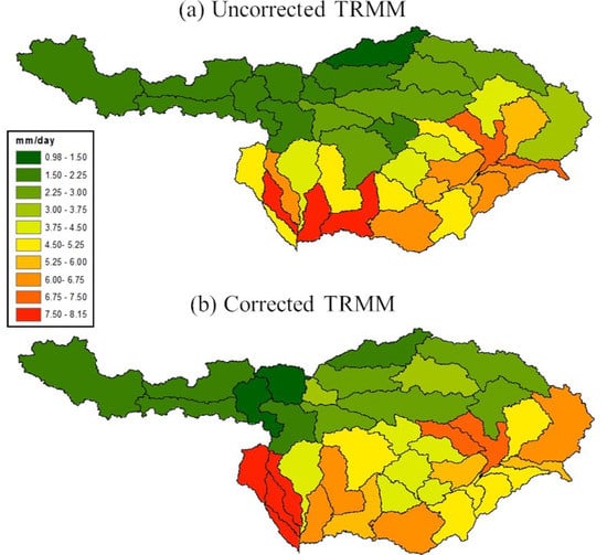 Figure 4a shows the annual average rainfall based on uncorrected TRMM for each catchment for 2014 of and Figure 4b shows the same with the corrected TRMM. We observed an increase in annual average rainfall on areas in the Himalayan slopes. The increase ranged from 10% to 114%. This corroborated with the findings of previous studies that TRMM usually underestimates more intense rains (Arias-Hidalgo et al. [14]). By correcting, we increased the magnitude of satellite-based rainfall estimates. On the other hand, the correction led to reduced rainfall amount in areas with low annual rainfall. The decrease ranged from 9% to 42%. The corrections perhaps could not remove all the errors. The RBC method for bias correction uses daily correction factor for each month or season, which works well when both the gauge and satellite-based rainfall estimates are available for a long period of time. The corrections applied here were based on data of one year. The correction factors varied from 0.18 to 2.42. Higher values were obtained for the wet months. The correction factors also varied spatially. Higher correction factors were observed in the Himalayan slopes. We hope that in the future longer period of gauge rainfall will be available to further improve the correction of the TRMM data. If longer time series of gauge rainfall data is available then more widely used probabilistic method Quantile Mapping [14] can be used. Another alternative to this method will be to use the discharge data at the outlet to correct the TRMM rainfall data [50], which however, is suitable only for small basins.