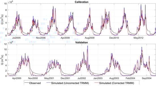 For the validation period NSC, R2 and RMSE values with the uncorrected and corrected TRMM data were 0.61, 0.77, 11,643 m3/s and 0.74, 0.79 and 9201 m3/s, respectively. This justifies the use of the corrected TRMM data. The magnitude and timing of the peaks were replicated well. Although the simulation results with the corrected TRMM data were better than the ones with the uncorrected TRMM it is noteworthy that the results with the uncorrected TRMM were similar to the simulation results with the corrected TRMM data. This justified the use of uncorrected global datasets in hydrological simulations of the basin.