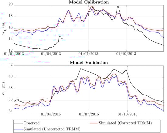 Analysis of accuracy of the hydrological model over the calibration and validation period with the uncorrected and corrected TRMM data.