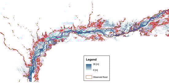 The flood inundation maps were compared with satellite images. The source of satellite observed flood maps was Dartmouth Flood Observatory [66]. Figure 7 presents a visual comparison with the simulated inundation map for Event-2. Overall, there is a good agreement between the simulated results and the observed flood extent. In particular, a good fit between the observed and simulated flood extent is achieved in the downstream part of the 500 km reach of the river. On the contrary, the model tends to overestimate flood extent in the upstream part. This could be related to the error in the interpolation of cross-sections (every 500 m) for assessing flood extent and in the errors in the river geometry extractions using SRTM data. It is worth noting that this information could be affected by different sources of error. Indeed, flood extent maps derived from remote sensing images suffer from over- and under-detection as well, due for instance to dry pixel with radiometry similar to the one of open water or objects masking water (“blind spots” due to vegetation and buildings). In particular, one issue in the downstream area of the Brahmaputra catchment (domain of the hydraulic model) could be the presence vegetation masking water which could lead to an underestimation of the flood extent [67]. Furthermore, it is also noteworthy that the simulation accuracy of the hydrological model directly affects flood inundation results. If the hydrological model under-predicts discharge then less inundation in the hydraulic modelling results may be observed and on the other hand if the hydrological model over-predicts discharge then larger inundation in the hydraulic modelling results may be noticed. Such an analysis is possible if measured discharge at more locations inside the basin is available. As this data was not available, this analysis was not carried out.