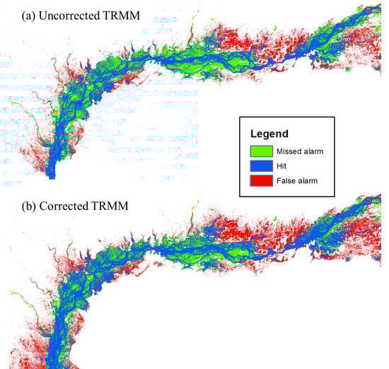 To further compare the simulated flood maps with the satellite-based flood maps, we estimated the parameter values for positive rejection, false alarms, hits and misses following the procedure presented in Section 3.5. The results of this analysis are shown in Figure 8 and it can be observed that both for the uncorrected and corrected TRMM a good hit rate is obtained, followed by a considerable number of false alarm areas. In particular, results obtained using uncorrected and corrected TRMM data show comparable results. However, it appears that the uncorrected TRMM tends to provide more missed alarms in the central and upper part of the 500 km river reach, while the corrected TRMM shows high false alarm areas in the downstream section of the reach. Results are encouraging considering the simplified hydraulic modelling set up. A more detailed analysis is provided in the next section.
