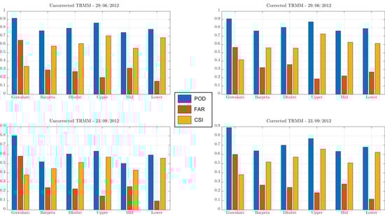 Subsequently, the POD, FAR and CSI indices were computed for the two flood events (see Section 3.5). It may be noted that a higher value of POD indicates larger number of grid cells, which are observed in the satellite image as flooded are also simulated as flooded (indicating good model performances). A lower value of FAR indicates smaller number of grid cells, which are observed in the satellite image as not flooded are identified as flooded in the simulation. The prediction skills are indicated by the CSI and a higher value indicates more grid cells are correctly identified as flooded or not flooded. As can be seen from Figure 10 the indices are comparable for both events. Overall, slightly better model performances are achieved (as expected) using the corrected TRMM. However, CSI values during the event in June 2012 (Event-1) are higher using uncorrected TRMM in Barpeta, Dhubri and the middle part of the river reach. For the event of September 2012 (Event-2) the indices obtained using the corrected TRMM are generally higher than the ones achieved with the uncorrected TRMM in all the 6 considered regions. It is also noticed that performance indices are generally higher during Event-1. This can be partly explained from the fact that the simulated discharge when compared to the observed discharge for Event-2 had larger error compared to that of Event-1. For Event-2 the simulated discharges at the chosen locations were less than actual and for that reason POD is less. Lower values of FAR for Event-2 can also be justified by this explanation. Therefore, the relatively low accuracy of the simulated inundation map for Event-2 was due to larger simulation errors in the hydrological model.
