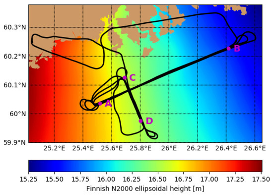 Flight path of the experimental campaign over the Baltic Sea. The background color of the sea indicates the ellipsoidal heights from Finnish N2000 system according to FIN2005N00 conversion surface [25]. The location of four reference waypoints (A, B, C and D) is indicated.