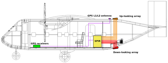 Location of main instrumental setup onboard Skyvan aircraft. Software passive reflectometry and interferometry system (PARIS) interferometric receiver (SPIR) is fed by 16 individual antenna elements, eight from the antenna array pointing to the zenith (orange) and eight from the antenna array pointing to the nadir (red). Ancillary GPS receivers and avionic antenna for navigation and time tagging (green and purple respectively) were also used, together with an inertial system synchronized to the GPS receivers (not depicted).