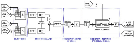Once the raw samples from both up- and down-looking antenna arrays were collected, summing up 3 TB of data, the next processing steps were done offline. Figure 4 provides a schematic flow chart of the whole process. First of all, the contributions from each element of the arrays are combined in order to coherently maximize the signal amplitude for a given direction, or in other words, to steer the main beam of the array factor towards that direction (beamforming process). With the target of GNSS-R altimetry, we point the up-looking array towards a desired GNSS transmitter and the down-looking one towards its corresponding specular point estimated over ellipsoid WGS84, as described in [24]. These computations required the precise position of the aircraft, obtained from standard GNSS data processing; the orientation of the arrays, estimated from the inertial measurements unit aboard; and the position of the visible GNSS constellation of transmitters, given by the International GNSS Service.