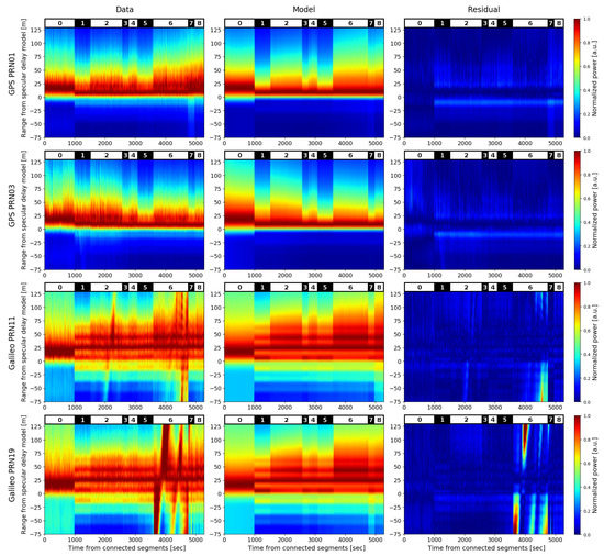 Before entering into discussion of the altimetric results, Figure 5 provides the time evolution of the normalized power waveforms (data and models) for different GNSS transmitters. In order to achieve a more effective representation, the tracks were connected in the temporal domain by following a sequential order from flight segment 0-BA until 8-DC. Then, the variable in the horizontal axis was understood as the relative time with respect to the first sample in segment 0-BA after removing inter-segment gaps (or time from connected segments). Its correspondence with the actual GPS time is given in Table 1. For practical reasons, the integration time in the present analysis was set to 10 ms (coherent) and 10 s (incoherent). As explained in [33], we found that such coherent integration offered a proper trade-off between SNR improvement and number of independent waveforms for the incoherent averaging. On the other hand, the 10 s interval provided enough reduction of speckle impact for a decent matching between the shape of data and model power waveforms. Moreover, in terms of time integration dependence of the altimetric errors, the results are consistent with those obtained in [23], so there was no added value on this respect.