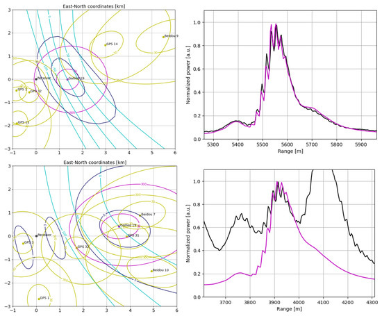 (Up) Clean example case for Galileo PRN19 at GPS second of the day (SoD) 39,200 (second #1070 in time from connected segments). (Bottom) Contaminated example case for Galileo PRN19 at GPS SoD 43,800 (second #4110 in time from connected segments). (Left-side) Simulated projection of iso-range (magenta color and meter units), iso-Doppler (cyan color and Hz units) and down-looking antenna array gain (dark blue color and dB units) contour lines over the sea surface for Galileo PRN19 (the origin is set to the vertical projection of the receiver’s location). The corresponding iso-range contours of additional GNSS signals in view are also plotted (yellow color and meter units). (Right-side) Normalized power waveform for data (black) and corresponding model assuming a single contribution from Galileo PRN19 (magenta).