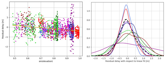 The left-side panel from Figure 7 provides the evolution of as a function of and the result of the linear fit from Equation (5). The values obtained for and are −0.60 m and 0.77 m respectively, with 0.05 m and 0.04 m of standard deviation. The first term was interpreted as the differential receiver’s height between data and model. By being a negative value, it means that the surface level sensed by the data was, on average, above the surface height of the model (set to Finnish N2000 height system) by 0.60 m. At a first glimpse, we can see that there is consistency among the results from the different GNSS signals and that a straight line properly describes their combined evolution. This impression is confirmed by the estimated probability density function of each case with respect to the linear fit, that are also shown in the right-side panel from the same figure. Their corresponding statistical moments are provided in Table 2. Although there was not a perfect alignment, which reveals that a finer tuning of the models is still required, the maximum distance between the mean values was just 0.37 m, which was similar to the minimum standard deviation obtained (0.35 m for GPS PRN01 at L1). Such differences in the mean values were behind the rise of skewness (in absolute terms) and kurtosis in the combined case.
