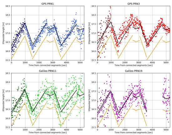 Time-series of (dots) for each PRN and frequency band (a darker tone is employed for L5). A solid line of the same color indicates the linear fit applied for each track. The corresponding values of (black) and Finnish N2000 height system (gold) are also plotted.