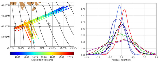 We will now evaluate the consistency between different tracks and GNSS signals, which is the main target of this study and represents an added value for GNSS-R altimetry. The left-side panel from Figure 9 illustrates the projection of the linear fits applied to over a map with the contour lines of Finnish N2000 height system plus the mean value of in-situ sea level estimation. The height gradient is consistently followed by the fitted retrievals obtained. There are some minor disagreements in the family of CD/DC tracks, corresponding to the cases at the lowest elevations. We can also notice this effect in previous Figure 8. However, taking into account the similar values obtained for and , we can assume that these results are caused by the limitation of the linear fit approach in these particular cases, where the length of the track is short compared to the height dispersion. In spite of that, by computing the height differences of the linear fits at the cross-over points, we obtain a mean square difference of just 0.19 m. The right-side panel of Figure 9 provides the estimated probability density function of for each GNSS signal. The results obtained basically confirms the previous conclusions: on one hand there is a good consistency among different GNSS signals, given that the separation between the mean values of these functions, ranging between 0.01 and 0.26 m, is similar to the minimum standard deviation obtained (0.23 m for GPS PRN01 at L1); but on the other hand some detailed refinement of the models would be required to reach a last minor improvement and getting a perfect alignment (e.g., a better knowledge of the power distribution of the code components from the different GNSS signals).