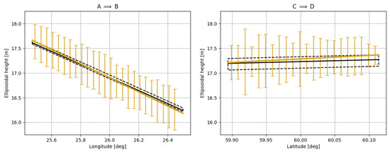 The last exercise consists of analyzing the two families of tracks by dividing them into two groups depending on the flight path. The first one takes into account the AB/BA tracks, where there is a significant ellipsoidal height gradient. Then, the values of are linearly fitted as a function of the longitude dimension from the specular point’s location. Similarly, the second group reunites the CD/DC tracks and the same type of computation is done but as a function of the latitude dimension, where there is a nearly flat ellipsoidal height variation. The solutions obtained compared against the corresponding averaged tracks of are shown in Figure 10. As expected from previous results, there is good agreement between them.