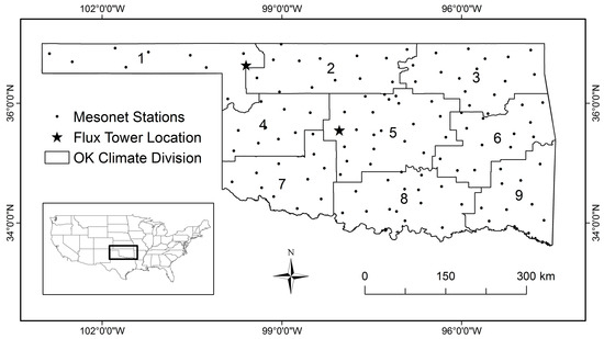 The study area covered the entire state of Oklahoma, USA, with an area of about 181,200 km2 (Figure 1). Oklahoma Climate is classified as humid subtropical at most parts of the state and cold semi-arid at far west [74]. The state has nine climate divisions (CD) delineated based on precipitation and temperature gradients. The normal (1981–2010) annual precipitation is about 925 mm yr−1, with significant spatial variation across CDs. While southeast (CD9) receives the largest amount of 1301 mm yr−1 on average, the Panhandle (CD1) holds the smallest record of 520 mm yr−1. The normal annual mean air temperature is 15.6 °C, with July and January being the hottest and coldest months, respectively. The southcentral (CD8) has the maximum mean annual temperature of 16.7 °C, whereas the Panhandle region has the minimum value at 13.6 °C. The top two land cover categories in Oklahoma are grassland (36.4%) and pastureland (11.3%) [75]. The elevation varies between 88 m above mean sea level at the southeast border with Arkansas and 1516 m at far-west border with New Mexico.