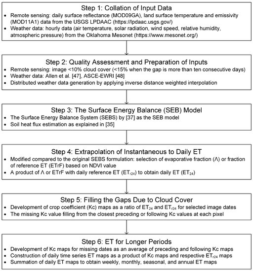Developing time series of ET maps requires complex, multi-step analyses to deal with issues associated with pre-processing of remote sensing data and post-processing of resulting ET products. The choice of the SEB model and satellite data could vary depending on intended applications of ET maps, availability and requirements of input data and availability of resources (time, money and expertise) to run the model. In general, the SEB-based ET estimation process can be divided into six steps: (i) collation of remotely sensed and ground-based input data, (ii) quality assessment of collected datasets and preparation of all necessary inputs for the selected SEB model, (iii) running the SEB model (including all modules and algorithms) to obtain the instantaneous ET at the time of satellite overpass, (iv) extrapolation of instantaneous ET to daily estimates, (v) filling the gaps due to cloud coverage over a portion of the map and (vi) interpolation of daily ET between image acquisition dates to obtain ET for longer time scales.