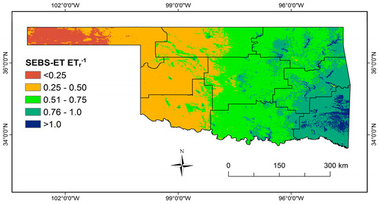 The ratio of SEBS-ET to ETr can be estimated on a pixel wise basis to provide information on water scarcity at a finer resolution for local water management and planning. This ratio is mapped in Figure 5. The general patterns are similar to those presented in Table 2, with western parts of the state under relatively larger water scarcity compared to the eastern parts. However, significant variability can be observed within some CDs. In CD1, for example, the western half of CD (Cimarron and Texas counties) had smaller ratios compared to the eastern half, suggesting a more severe water scarcity. CD2 was similar in terms of variations in the ET ratios across the CD. The surface water resources in western Oklahoma were visible in regions with a ratio value of more than 0.5. Examples include the riparian areas of Cimarron and North Canadian rivers in southwest of CD2, as well as Canton Lake and Foss reservoir in CD4 and the five reservoirs in CD7 (Lugert-Altus, Tom Steed, Lawtonka, Ellsworth and Fort Cobb). Maps similar to the one in Figure 5 can be developed at varying temporal and spatial scales to monitor changes in water availability more closely. The ratio of actual ET to reference or potential ET has been used in the past in monitoring water stress and drought, such as in the Evaporative Stress Index [17].