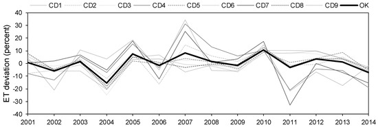 The inter-annual variations in ET were also examined for each CD and for the entire state. Figure 6 demonstrates deviations in SEBS-ET as percentage of the average annual ET during the 2001–2014 period. The impact of the 2011–2014 drought in western Oklahoma can be observed in this graph, with the maximum reduction in ET occurring in 2011 for the three western CDs of CD1, CD4 and CD7. The percent deviations from average was −22%, −21% and −33% for the same CDs, respectively. According to the U.S. Drought Monitor (USDM) [116], more than 80% of the three CDs was under extreme drought (D3 category) from June. The drought condition worsened in July and remained under D4 category until December 2011. The three eastern CDs of CD3, CD6 and CD9 were above average in 2011, with percent deviations of 9%, 8% and 10%, respectively. The USDM indicated almost no drought at CD3 in 2011, whereas CD6 and CD9 had less than 40% of their area under extreme drought from August to November 2011. The middle three CDs registered close to long-term average ET. The largest positive deviations for the three western CDs occurred in 2007, a year that was characterized by above normal precipitation.