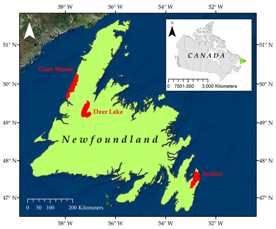 The three study areas located in Newfoundland and Labrador, Canada, at the eastern, center, and western portions of the island were selected for this research (see Figure 1). In general, the island of Newfoundland has a humid continental climate, which is greatly affected by the Atlantic Ocean.