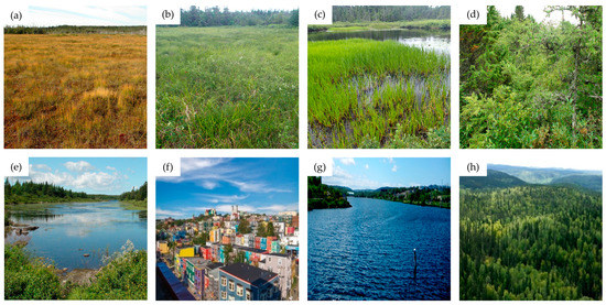 Figure 2. Examples of land cover classes in the Avalon study area, including (a) bog, (b) fen, (c) marsh, (d) swamp, (e) shallow water, (f) urban, (g) deep water, and (h) upland.